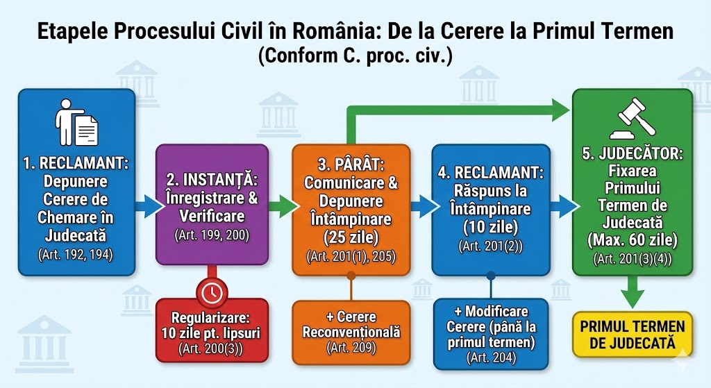 Acesta este, în cele mai multe cazuri, parcursul unui dosar civil până la stabilirea primului termen de judecată.