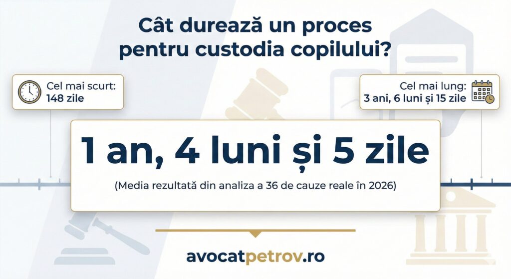 Un proces pentru custodia copilului (exercitarea autorității părintești) durează, în medie, 1 an, 4 luni și 5 zile (490 de zile), conform celui mai recent studiu efectuat pe 36 de cauze soluționate de Judecătoria Constanța. Deși toată lumea caută informații despre „custodia copilului”, în instanță procesul poartă denumirea juridică de exercitarea autorității părintești, procedura fiind însă aceeași.