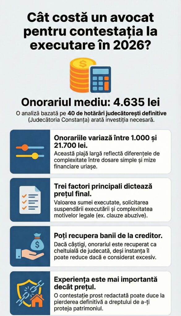 Atunci când te trezești cu conturile blocate sau cu o somație de plată, prima întrebare este: „Cât mă costă să mă apăr?”. În 2026, onorariile avocaților pentru o contestație la executare variază semnificativ în funcție de miza dosarului și de complexitatea motivelor de nelegalitate invocate.